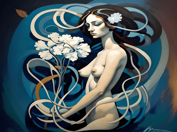 In the artwork titled “GoGo,” the focal point is a woman striking a dynamic pose reminiscent of a gogo dancer. The color palette predominantly consists of dark yellow and azure green, creating a vibrant and electrifying atmosphere. The woman’s silhouette exudes sensuality and confidence as she moves with an air of allure and vitality. This piece captures a moment of spirited performance and sensual expression, embodying the essence of the “Surreal Sensuality” collection. It invites viewers to immerse themselves in the world of dance, music, and the celebration of feminine energy, where sensuality takes center stage in a captivating dance of colors and forms.
